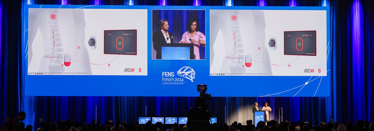 The eleventh Hertie Foundation Lecture took place on 29 June 2024 at the Forum of European Neuroscience in Vienna (Austria). The speakers were Prof. Dr. Gregoire Courtine and Dr. Jocelyn Bloch, scientists working at the École Polytechnique Fédérale de Lausanne (Switzerland). The title of their talk was "Neurotechnologies that reverse motor and autonomic paralysis".